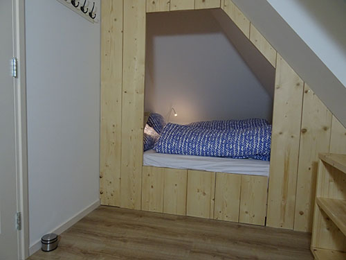 Op de bovenverdieping zijn de slaapvertrekken gesitueerd. De grote slaapkamer beschikt over een televisie en een tweepersoonsbed met aparte matrassen en dekbedden. Op de verdieping vindt u tevens de bedsteekamer, waar twee slaapplekken met aparte dekbedden te vinden zijn.